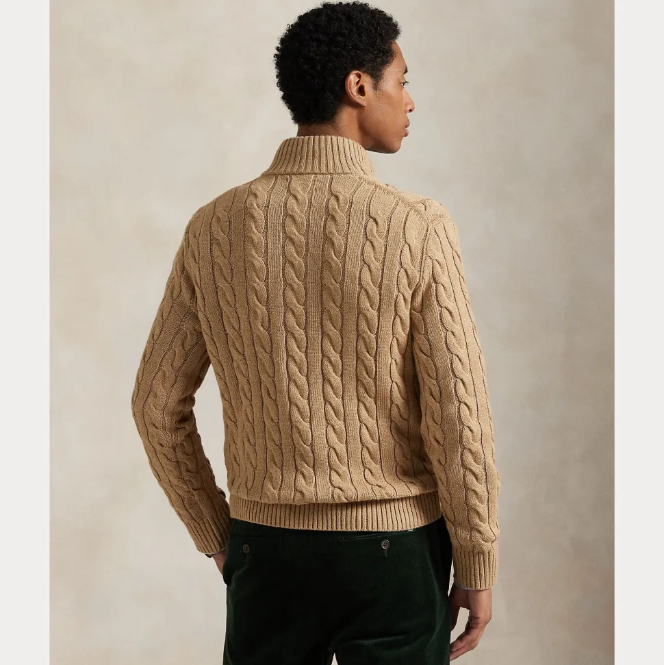 Polo Ralph Lauren Cotton Cable Driver Half‑Zip Pullover Beige on miesten palmikkoneule, valmistettu 100 % puuvillasta. Siinä on korkea mock‑kaulus ja puolivetoketju edessä, ribatut reunat sekä pitkät hihat regular fit -leikkauksella.