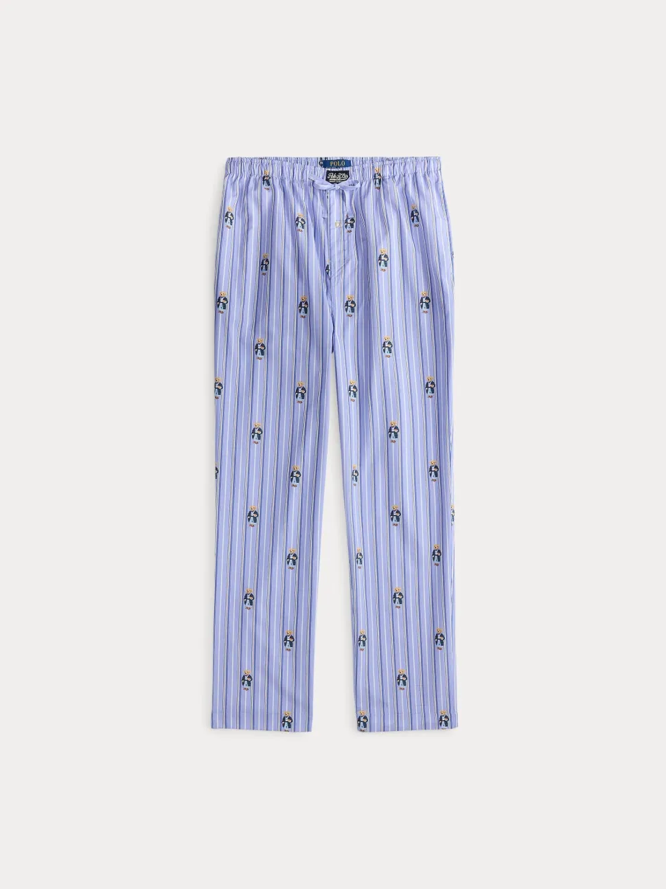 Näissä raidallisissa puuvillapyjamahousuissa on kauttaaltaan kuvio poolokarhusta, jolla on yllään Ralph Laurenin ikoninen krikettipaita ja madras-housut.