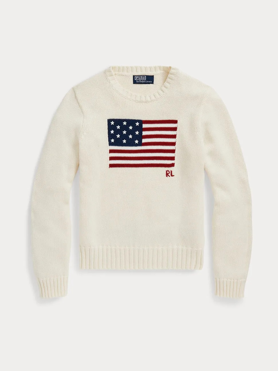 Yhdysvalloissa valmistettu Polo Ralph Laurenin ikoninen American Flag -neulepaita ilmentää Mr. Laurenin pitkäaikaista rakkautta amerikkalaiseen tyyliin. Tämä versio on valmistettu puuvillakankaasta, jolla on teksturoidtu pinta, ja siinä on intarsianeulottu lippuaihe 13 kirjailtua tähteä.