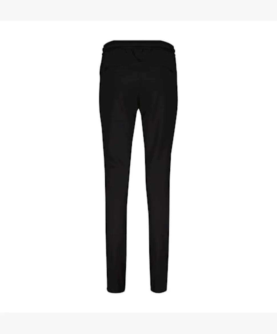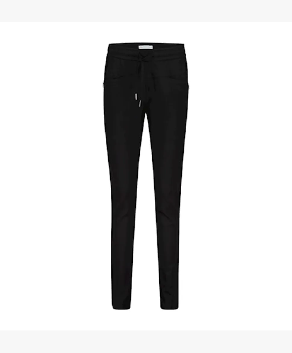 Naisten housut joustovyötäröllä. Materiaali on liukaspintainen, joten housut on kiva pukea myös mekkojen ja pidempien neuleiden kanssa. Housuissa on korkeavyötärö kiristysnauhalla, kapenevat lahkeet ja edessä taskut sekä vetoketjusomisteet. Huippumukavat ja helppohoitoiset housut monenlaiseen käyttöön.