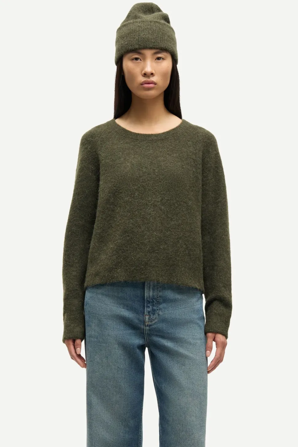Samsoe&Samsoen pörröpintainen villaneule väljää mitoitusta. O-pääntie, raglanhihat, helmassa löysä resori.