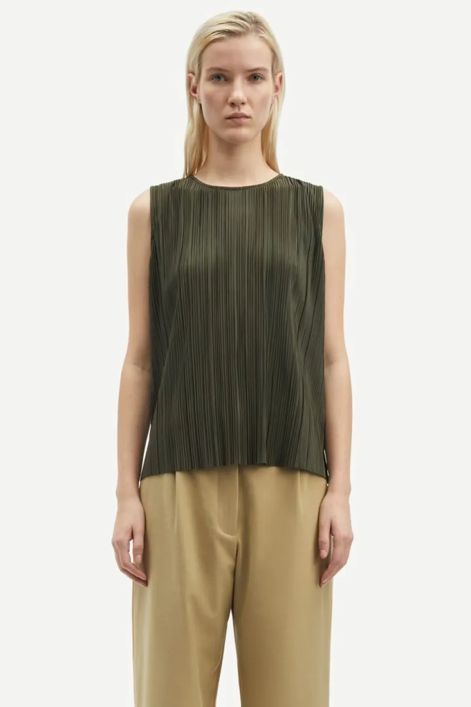 Pliseerattu toppi regular fit istuvuudella. Takana silmukka- ja nappikiinnitys.