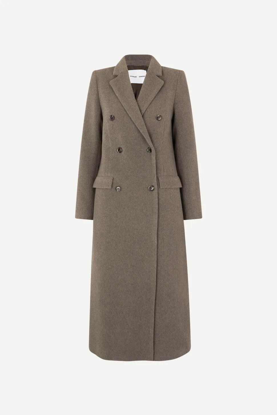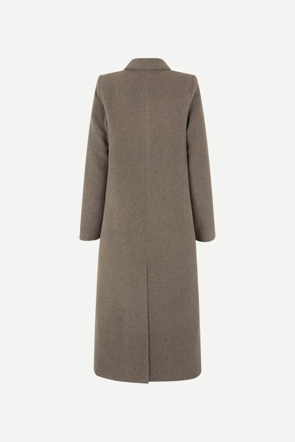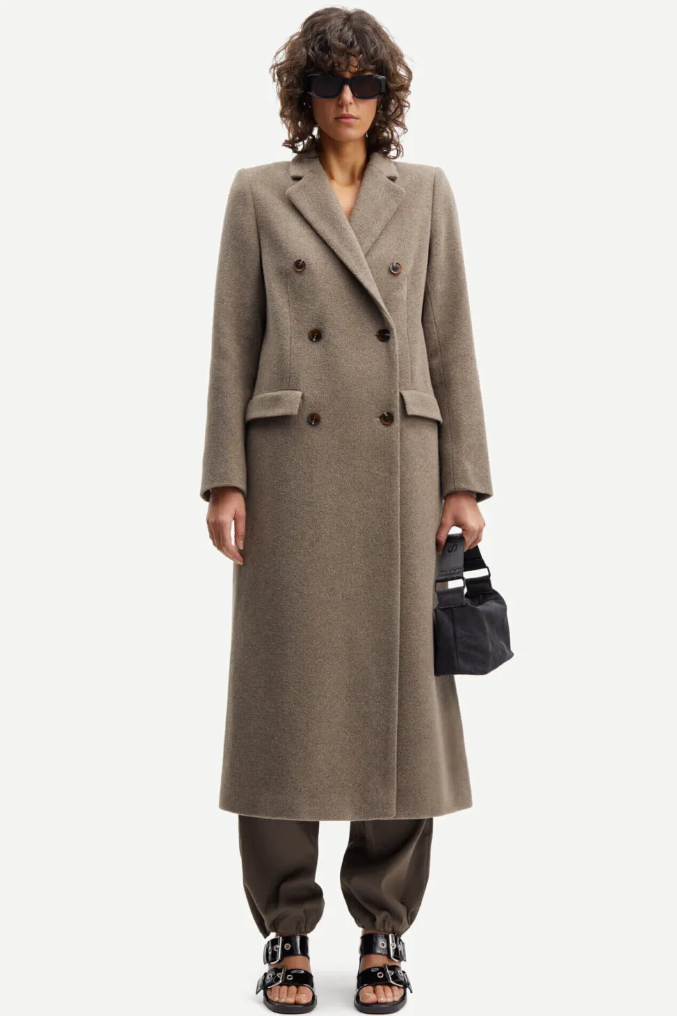 Pitkä kaksirivinen takki, jossa suora leikkaus. Nappikiinnitys. Lovitettu käännekaulus. Edessä läpälliset taskut. Pitkä takahelman tuuletusaukko. Vuorattu. Kierrätetty villa ja kierrätetty polyesterisekoitettu kangas. Mallimme on 177 cm pitkä ja käyttää kokoa S.