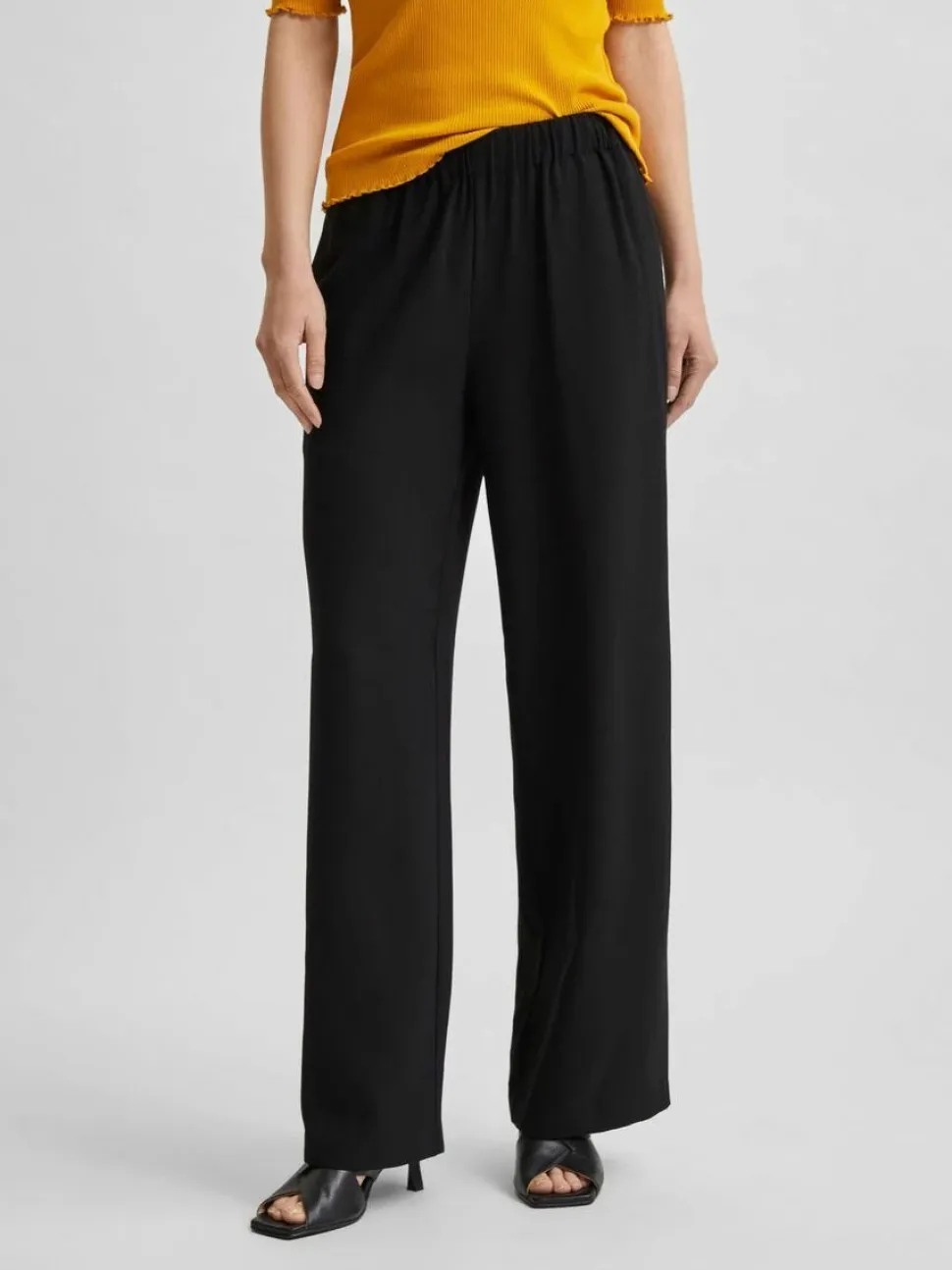 Selected Femme naisten leveät housut joustavalla keskikorkealla vyötäröllä. Taskut sivusaumoissa, rento istuvuus jossa tilaa liikkua.