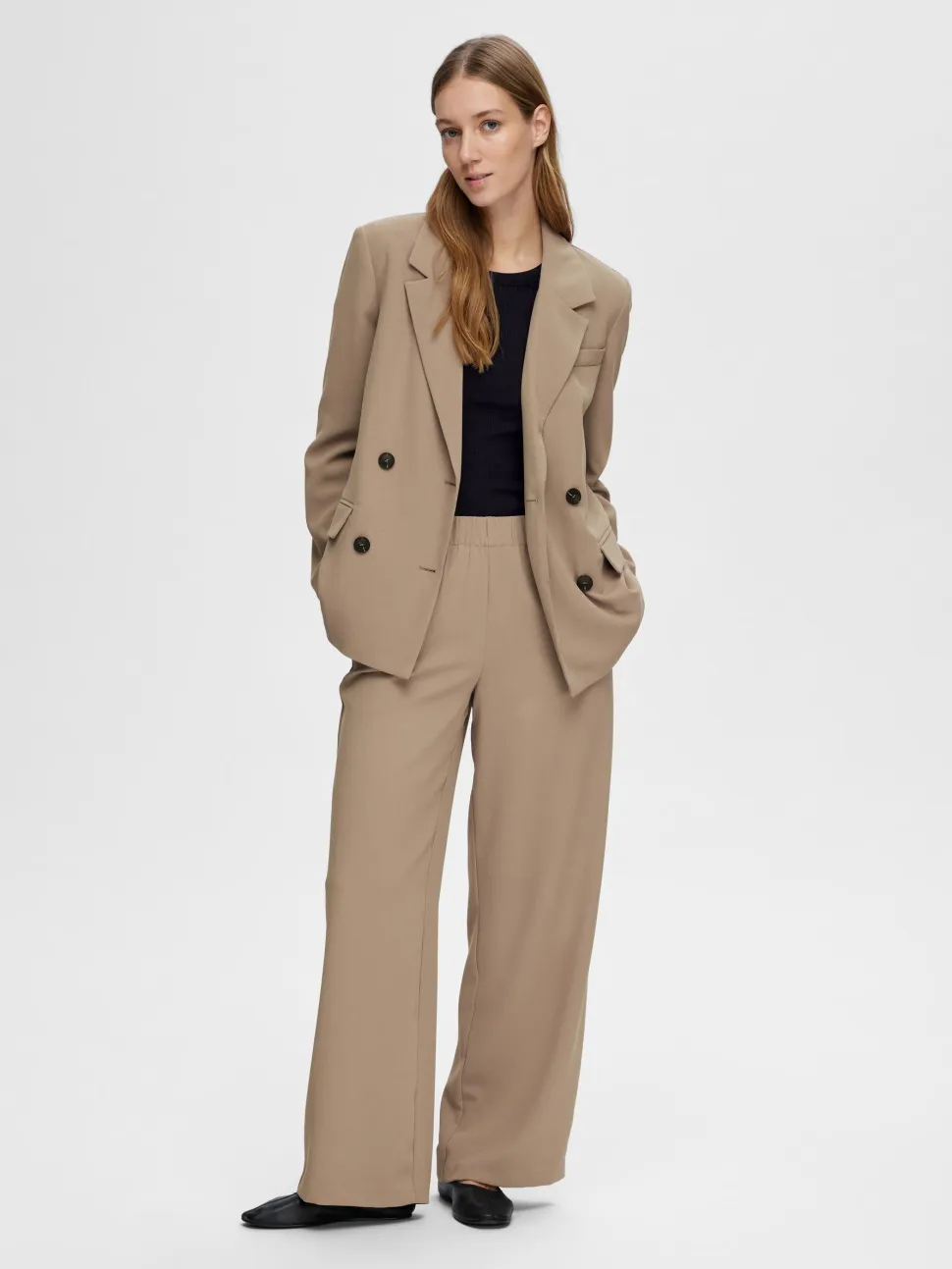 Selected Femme naisten leveät housut joustavalla keskikorkealla vyötäröllä. Taskut sivusaumoissa, rento istuvuus jossa tilaa liikkua.