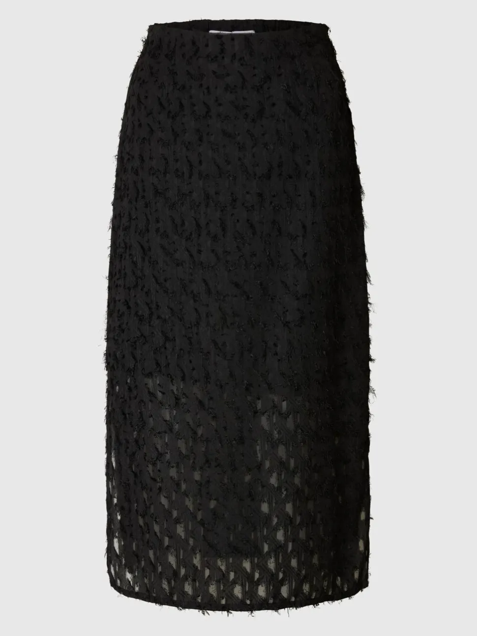 Tee tyylikäs katseenvangitsija tällä midi-pituisella hameella. Se on läpikuultava, teksturoitu jacquard-kuvioinen ja näyttää upealta mustan bodyn ja ylisuuren bleiserin kanssa. Täydennä asusi slingback-korkokenkien kanssa.