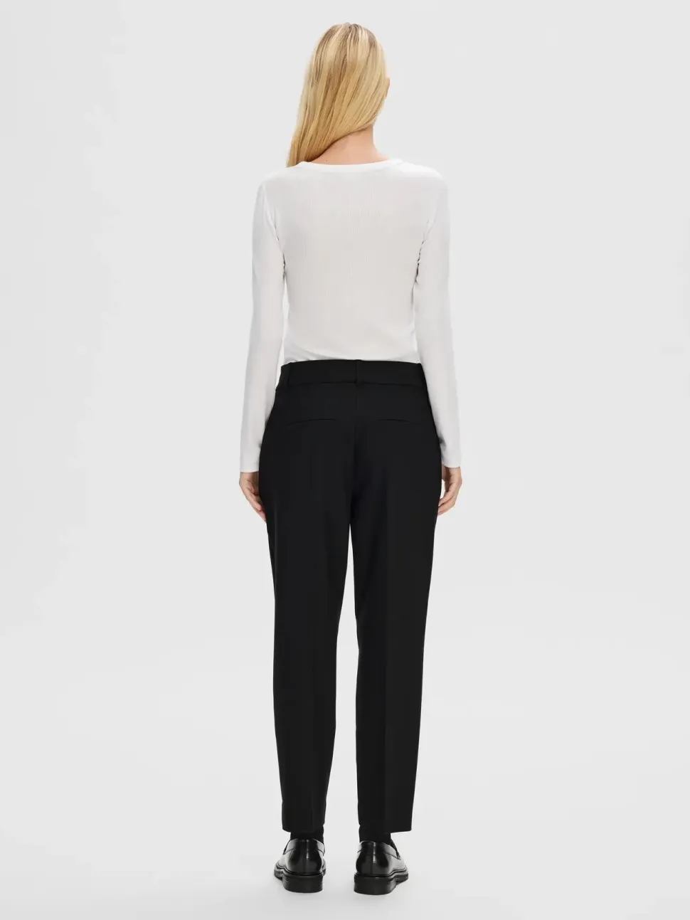 Selected Femme naisten suorat housut. – Keskikorkeat – Vetoketju edessä – Vyölenkit – Sivu- ja takataskut – Pituus nilkkaan asti – Slim fit