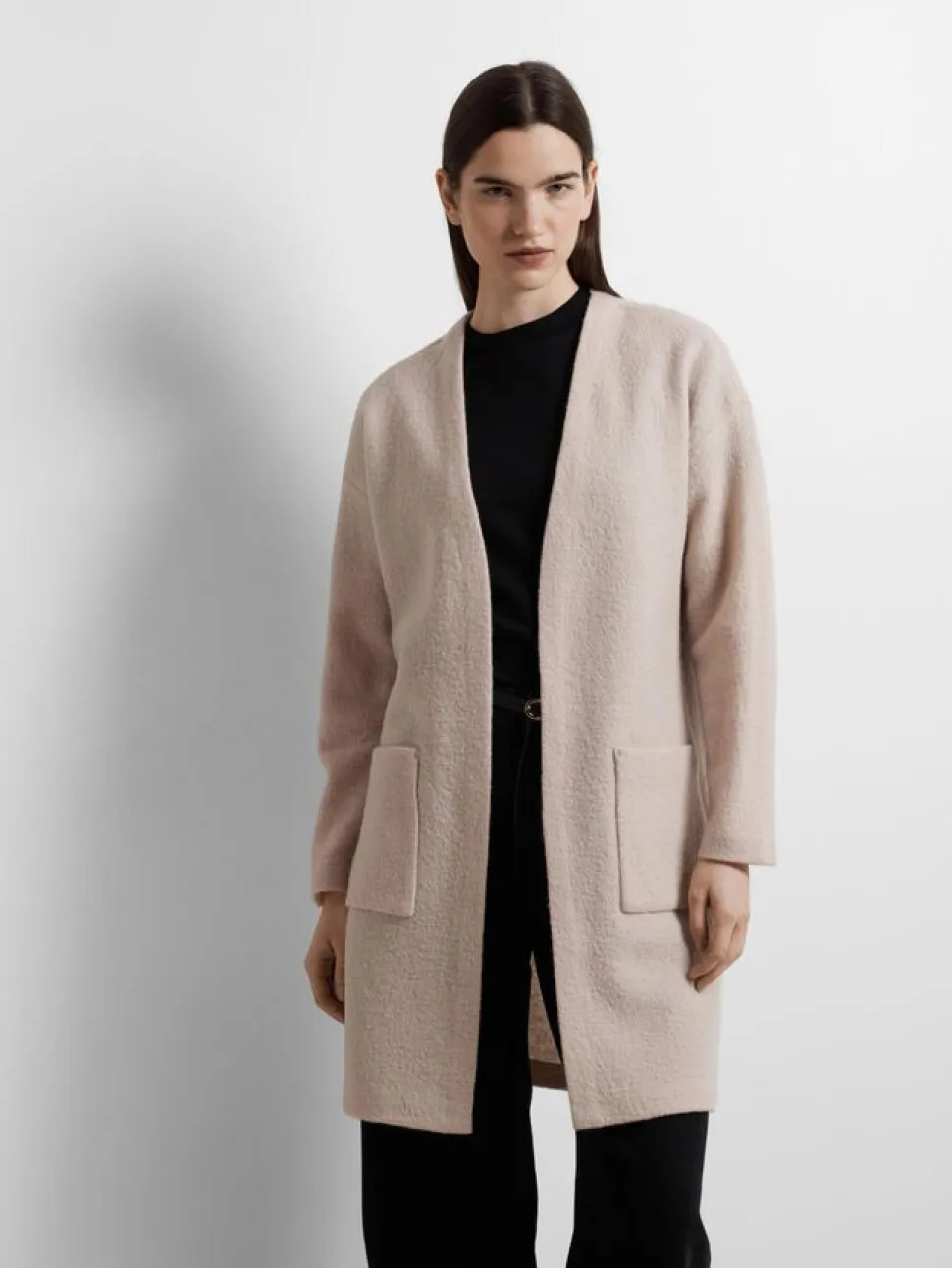 SELECTED FEMMEn merinovillainen neuletakki. Lasketut olkasaumat ja kapenevat, pitkät hihat. Suora malli, jossa ei kiinnitystä, joten voidaan käyttää hyvin jakun tai takin korvikkeena. Päälitaskut, joissa on ihana lämmitellä käsiä. Väri kaunis puuteri.
