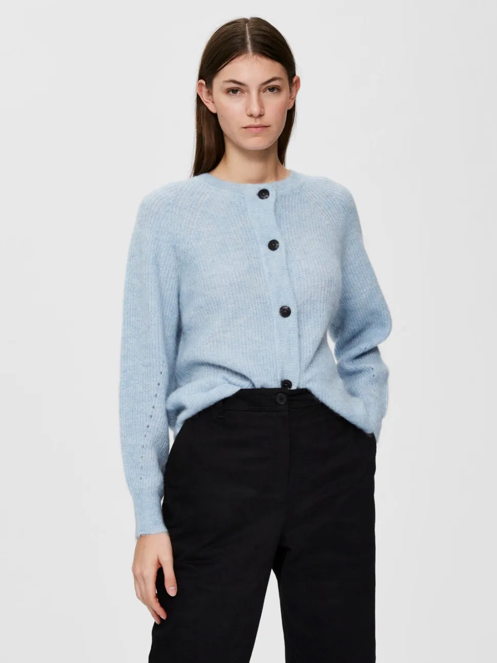 Selected Femmen ihastuttava neuletakki, joka on valmistettu pehmeästä ja laadukkaasta villasekoitteesta. Neulottu pinta, .pyöreä pääntie ja näyttävät napit edessä.