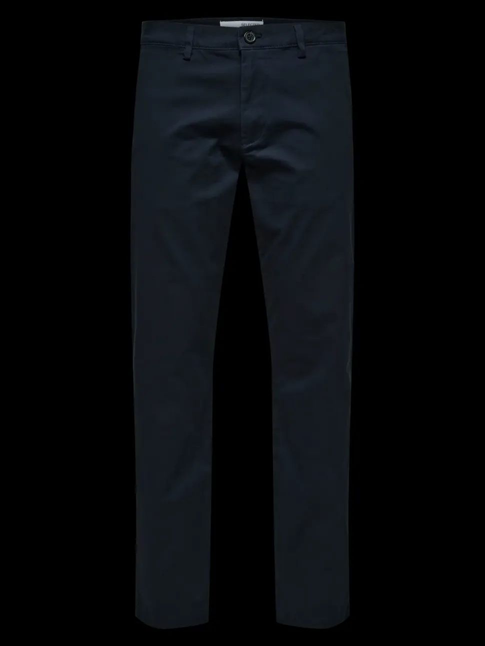 Selectedin Slim Fit malliset chinot. Vaatekaapin peruspilareihin kuuluvissa chinoissa on sivutaskut, vetoketju/nappikiinnitys, nilkkapituiset lahkeet ja vyönlenkit. Nämä housut on valmistettu LYCRA® T400® -kuituinnovaatiosta, joka tarjoaa pitkäkestoisen istuvuuden ja muodon säilymisen