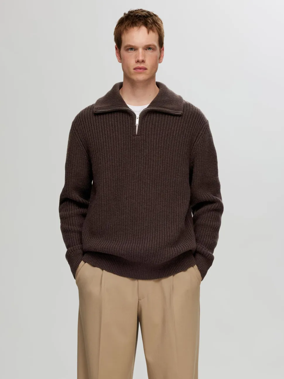 Mieste neulepusero ns. patenttineuletta, jossa korkea kaulus puolivetoketjulla .