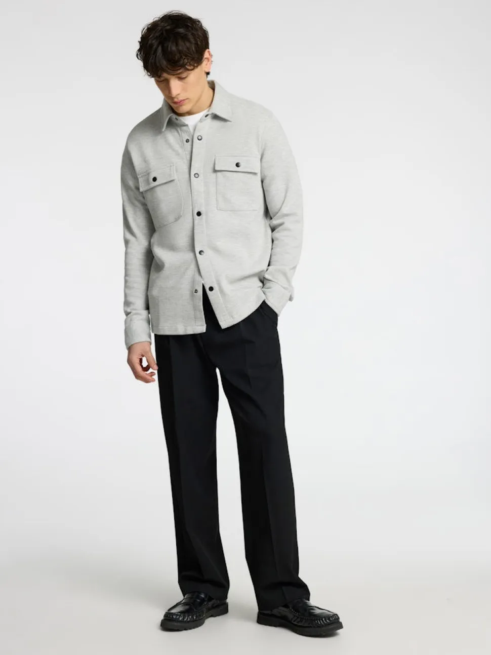 Selectedin rento ja trendikäs paitatakki. Kaulukset ja nepparikiinnitys edessä. Läpälliset rintataskut nepparilla. Materiaali joustavaa ja pehmeää luomupuuvillasekoitetta.