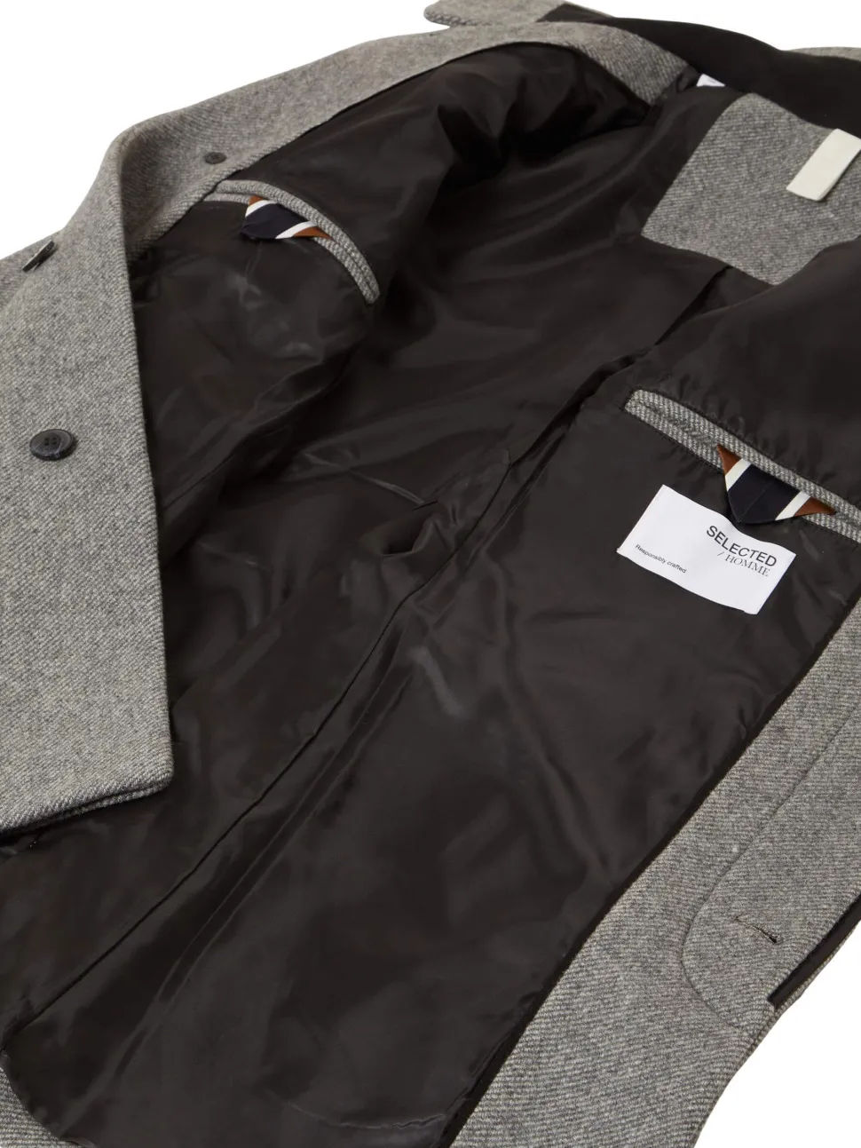 Selectedin miesten korkeakauluksinen villakangastakki. – Korkea kaulus – Napitetut hihansuut – Nappikiinnitys – Mitoitus polven yläpuolelle – Sivutaskut