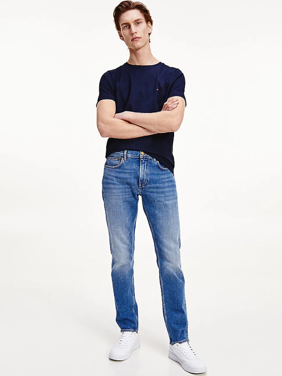 Tommy Hilfigerin farkuissa on hiukan väljä istuvuus, suoralla lahkeella. Materiaali on joustavaa puuvilla-elastaania