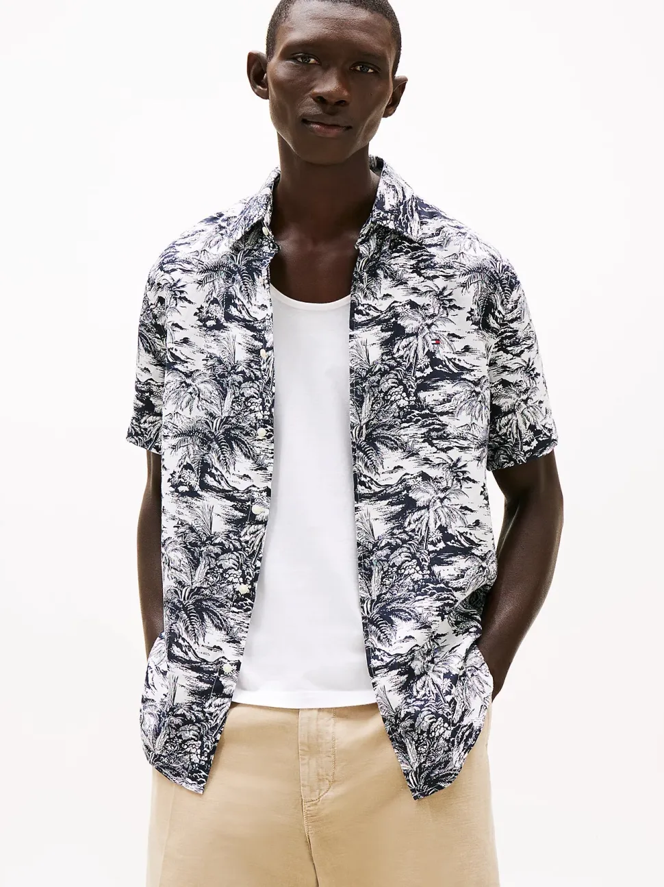 Tommy Hilfigerin Tropical Print Pure Linen -kauluspaita tuo kesäisen tunnelman pukeutumiseesi. Valmistettu 100 % puhtaasta pellavasta, tämä lyhythihainen paita tarjoaa hengittävyyttä ja keveyttä lämpimiin päiviin. Tropiikkiaiheinen printti ja rento leikkaus tekevät siitä täydellisen valinnan niin rantalomalle kuin kaupungin kaduille.