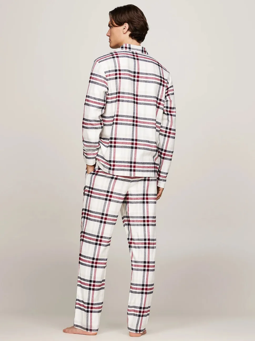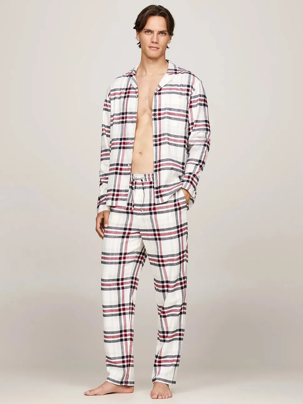 Tommy Hilfigerin rento ja mukava flanellipyjamasetti. Paidassa on puolileveäkaulus ja yksi rintatasku. Housuissa on elastinen nauhavyöträrö ja kaksi sivutaskua.