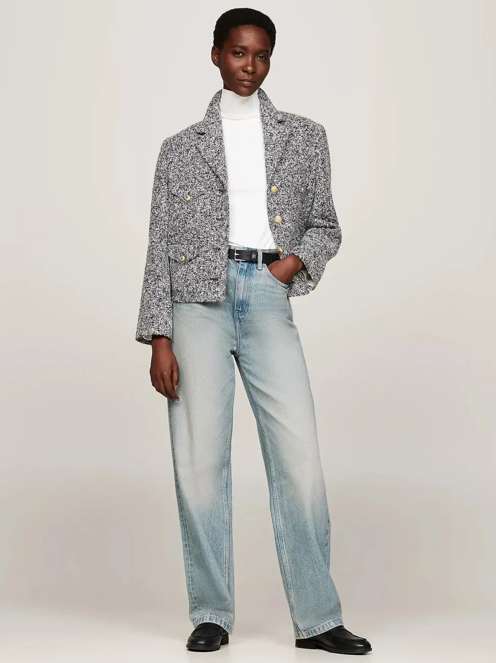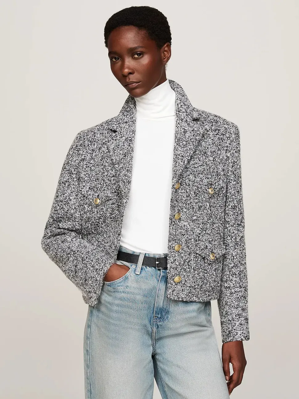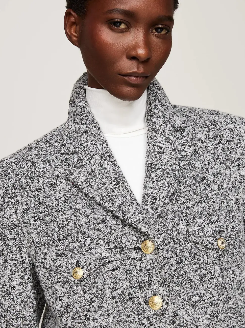 Täysin vuorattu jakku, joka on viimeistelty kullanvärisillä napeilla.