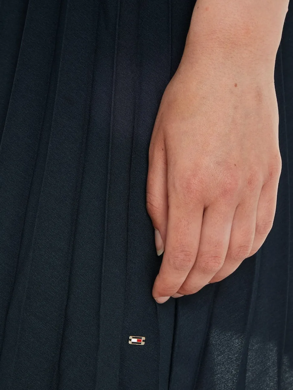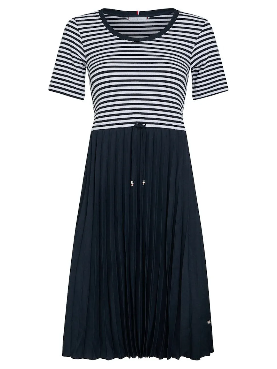 Naisten puolihihainen mekko pliseeratulla helmalla. Mekon yläosa on raidallista ribneulosta ja alaosa on polyesterkangasta. Vyötäröllä on nauhakujaan pujotettu kapea solmittava trikoovyö.