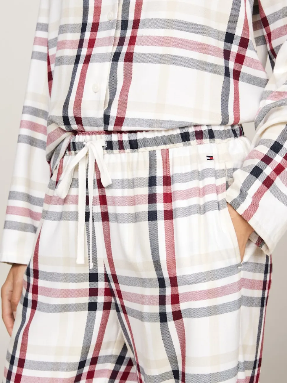 Tommy Hilfigerin rento ja mukava flanellipyjamasetti. Paidassa on puolileveä kaulus ja housuissa löytyy kiristysnauhavyötärö.