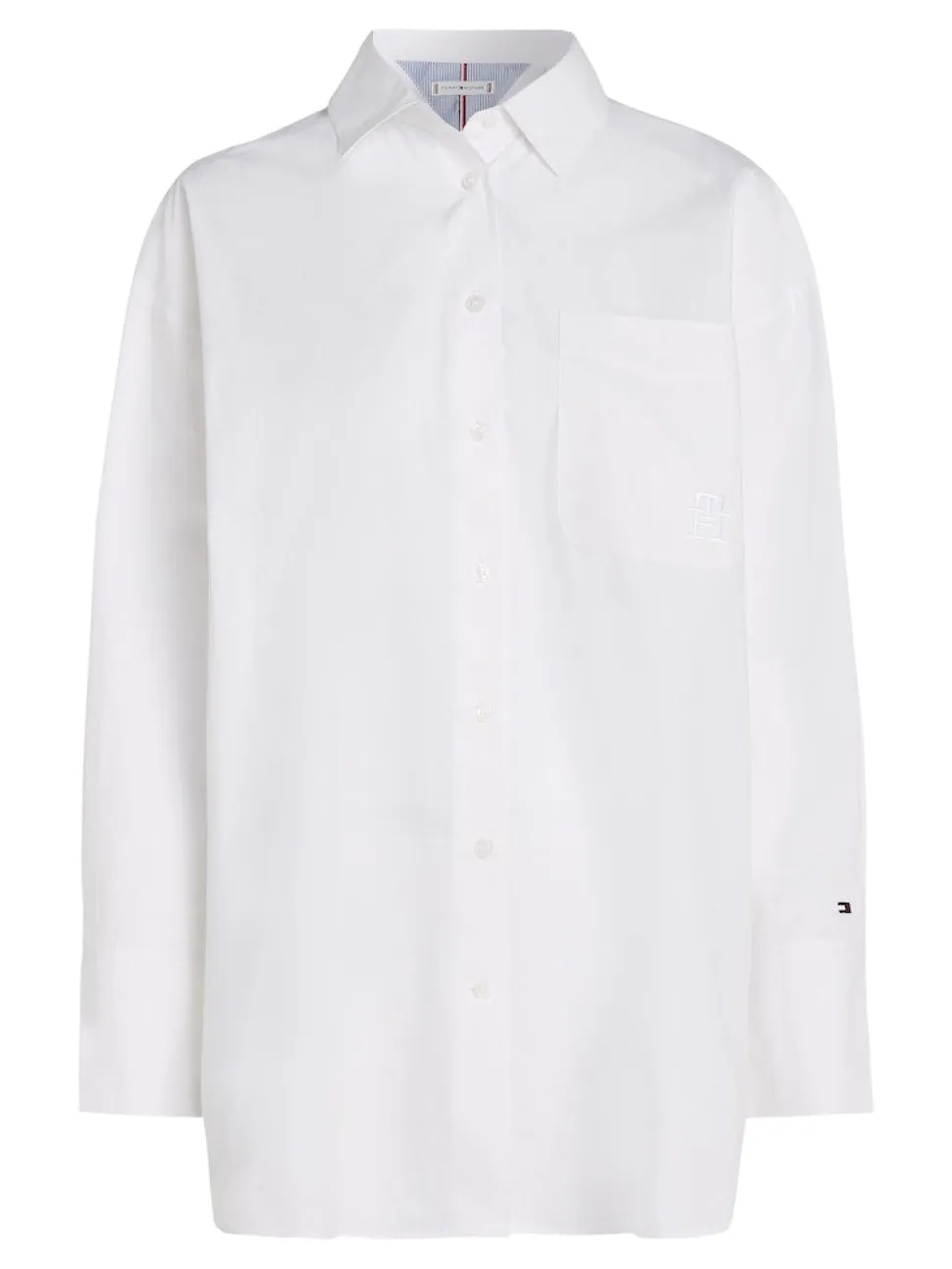 Rento ja väljästi istuva kauluspaita luo modernin lookin. Pyöristetty helma ja Tommy Hilfiger -brändäys hihansuussa.