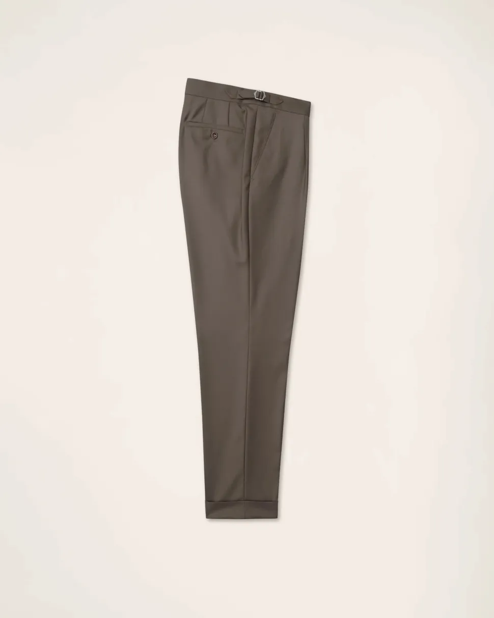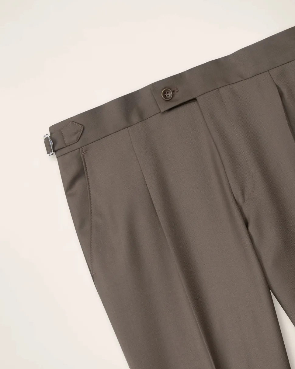 Näyttävät ruskeat puvunhousut ylellisellä Vitale Barberis Canonicon villakankaalla. Slim fit -leikkaukseen tehty, joka värinsä puolesta sointuu luontevasti kaikkiin kevään ja kesän juhlallisuuksiin. Housuissa sivukiristimet, upslaakit ja vekit vyötärökaitaleella.