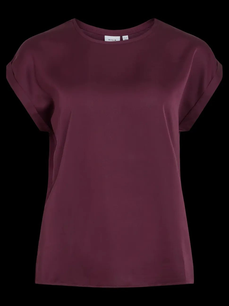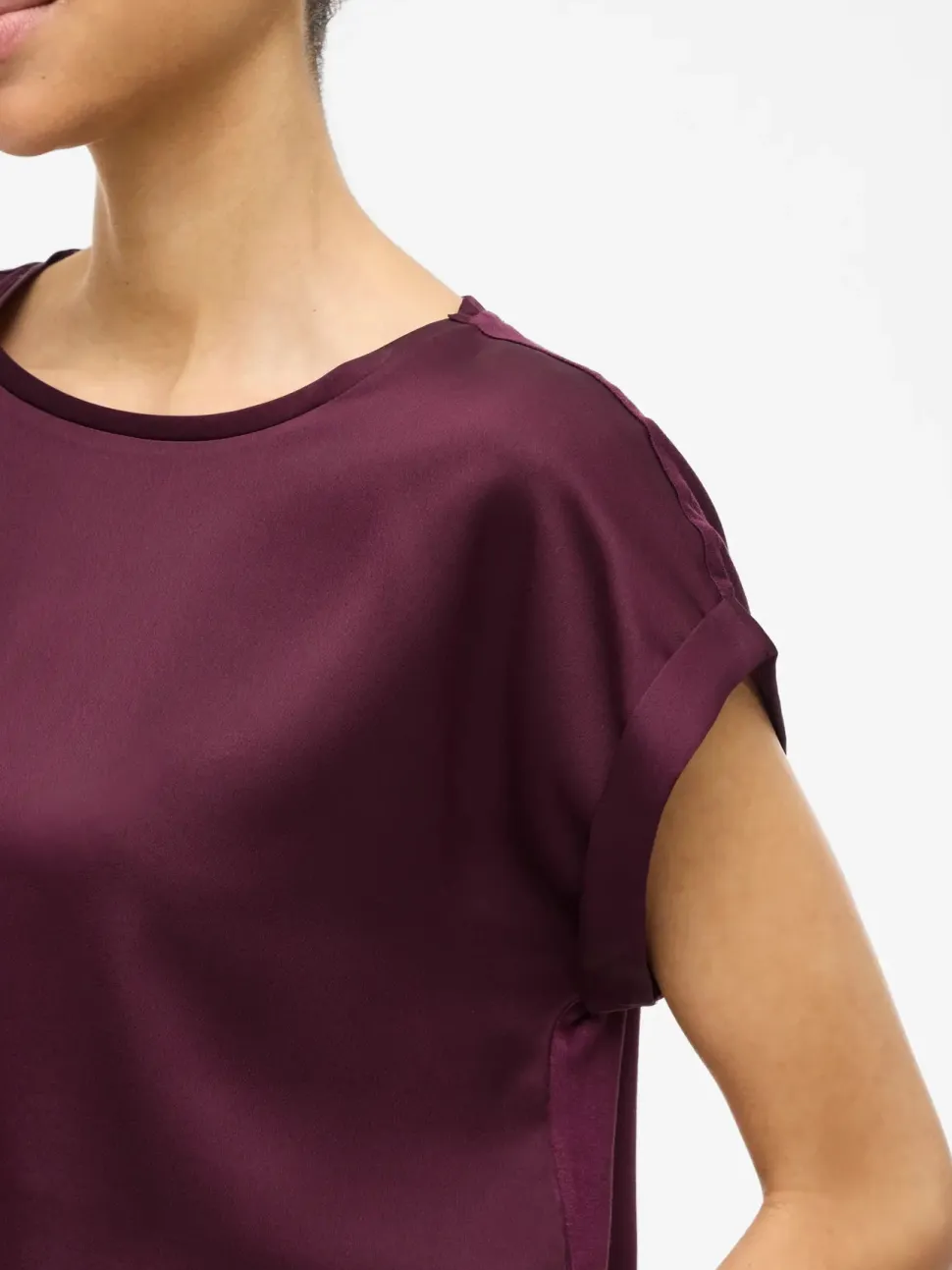 – Lyhythihainen toppi, jossa on pyöreä kaula-aukko – Satiinimainen pinta – Kevyttä materiaalia – Joustamatonta materiaalia – Pituus: 61 cm (koko 38) – Hihojen pituus: 11 cm (koko 38) – Malli on 178 cm pitkä, yllä koko 38.