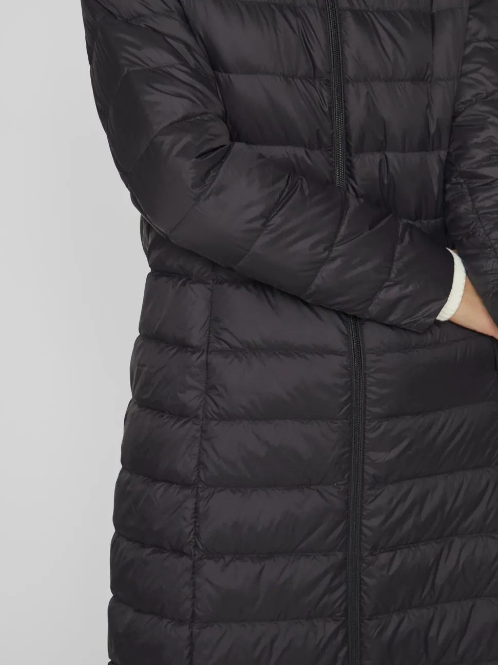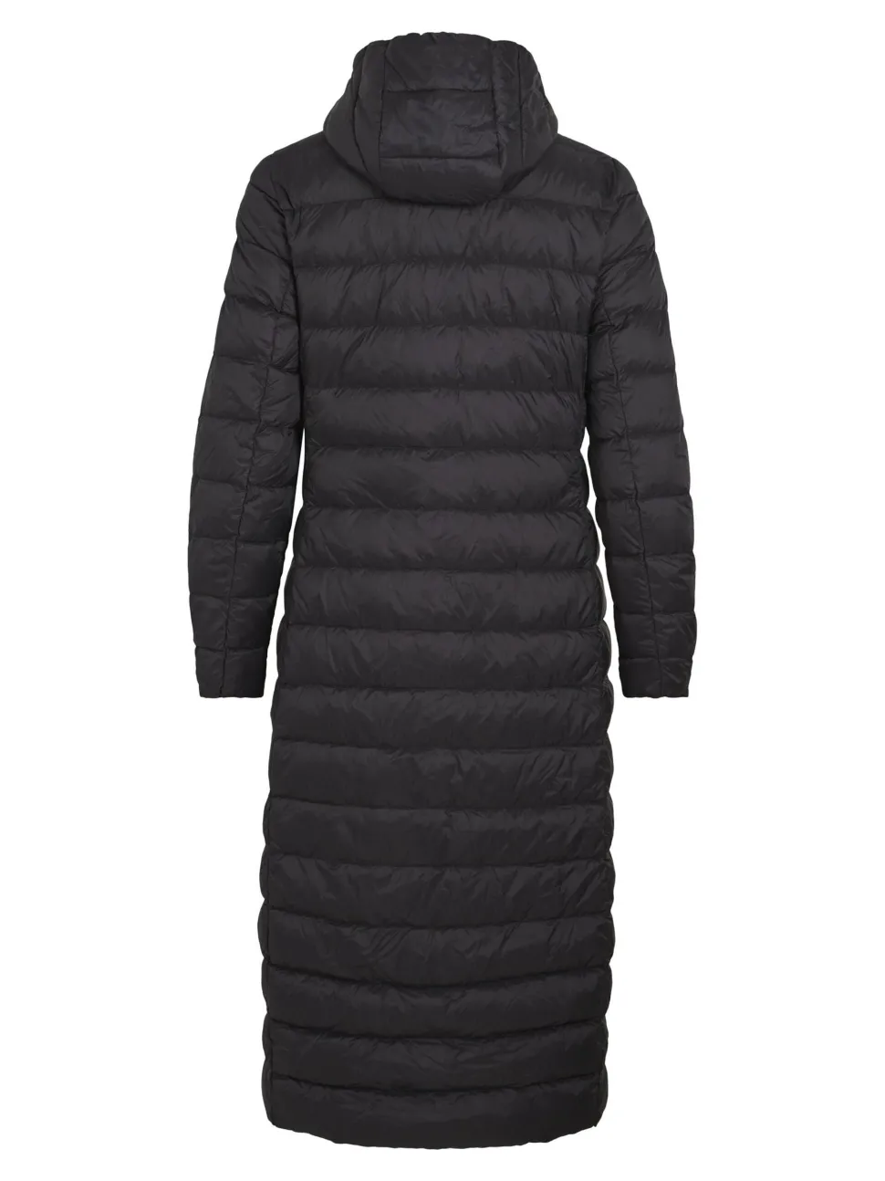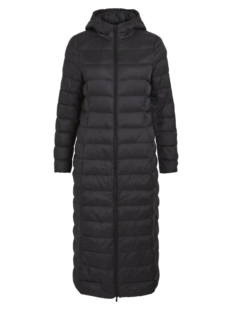 Naisten pitkä hupullinen untuvatakki. Takissa edessä sivuilla taskut. Takin vetoketju kaksisuuntainen.