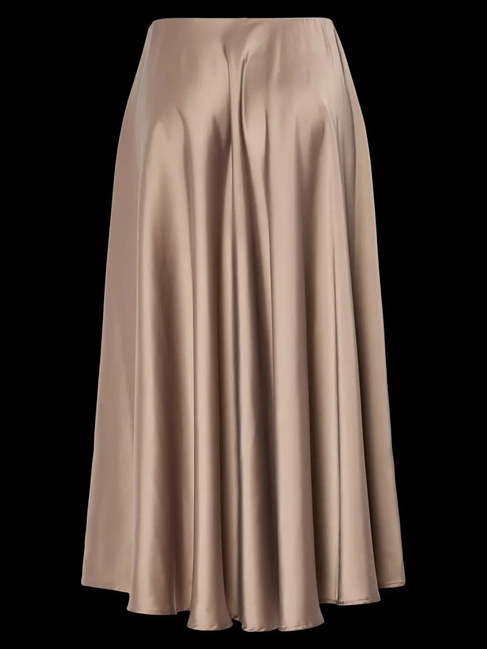 Kaunis nilkkamittainen puolikello satiinihame. Kellotuksen ansiossa helma on väljä ja lisää siihen mukavuutta, mutta samalla juhlavuutta. Tämä hame toimii juhlavammissa tilaisuuksissa ja arkisemmin vaikka neuleen kanssa.