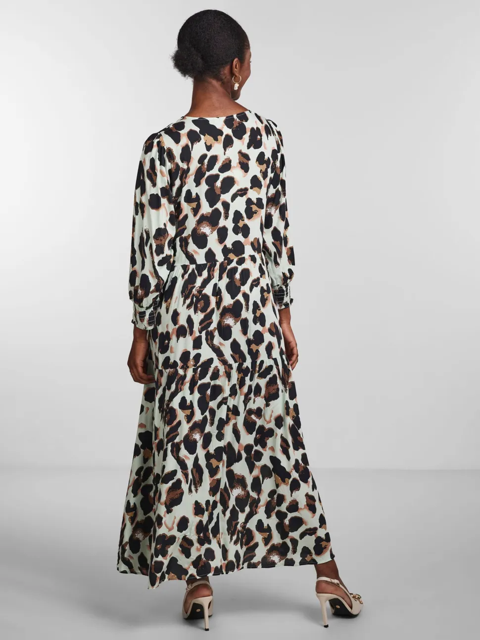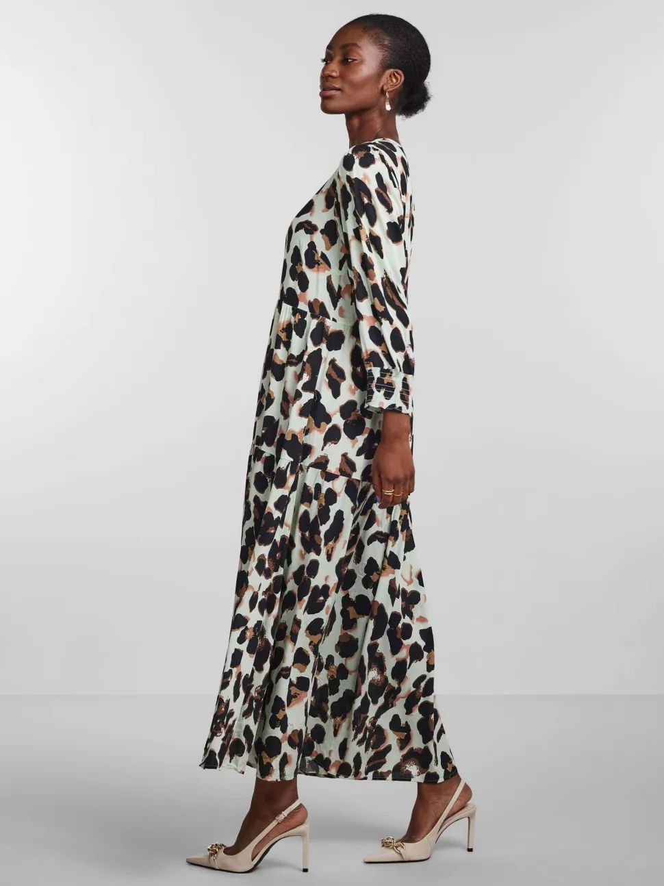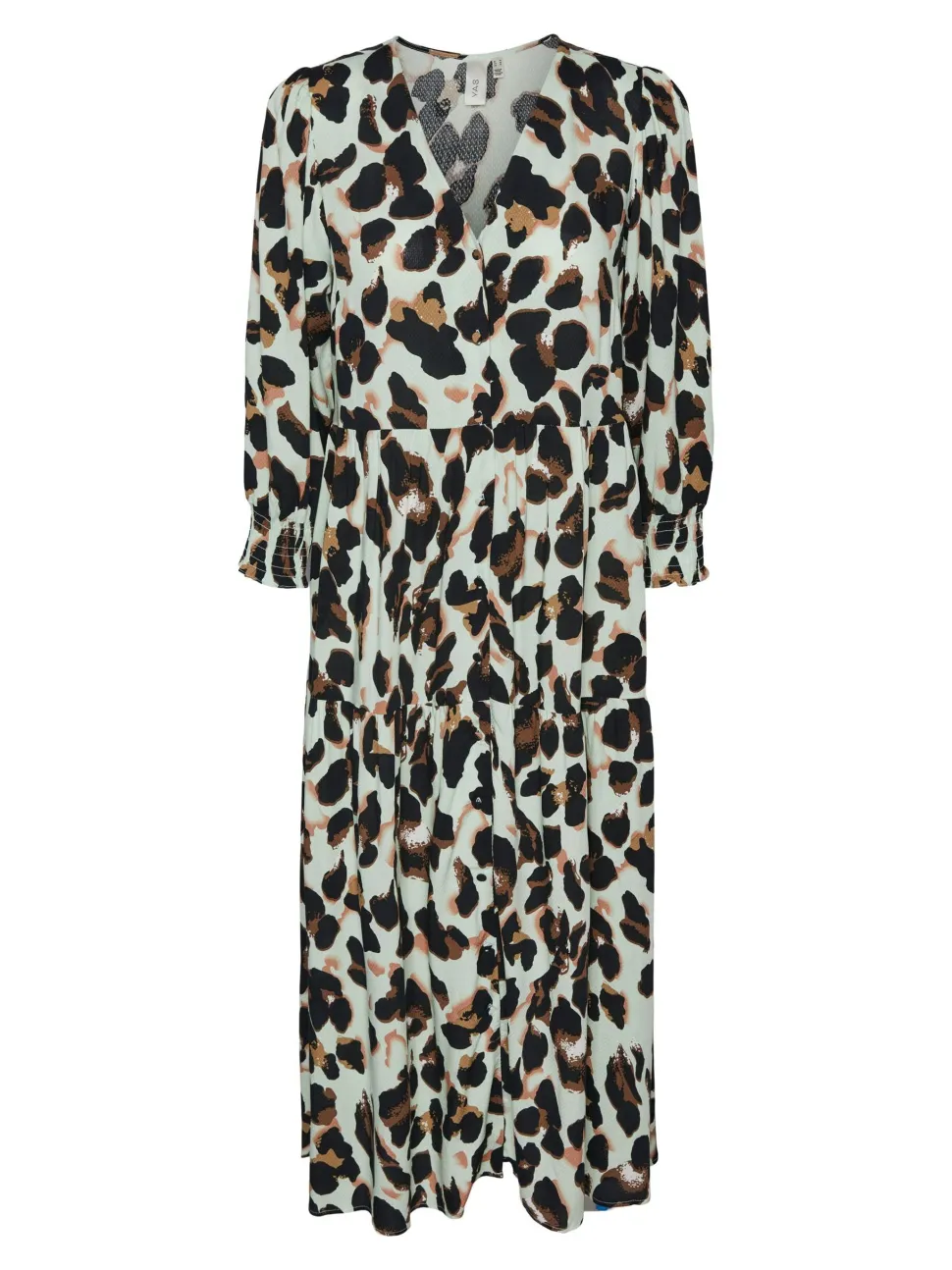 Kaunis midimittainen mekko, joka on valmistettu kevyestä ja kauniisti laskeutuvasta viskoosista. Mekossa on V-pääntie, vajaamittaiset hihat leveällä kuminauharesorilla. Napitus edessä, sauma vyötäröllä. Rento istuvuus.