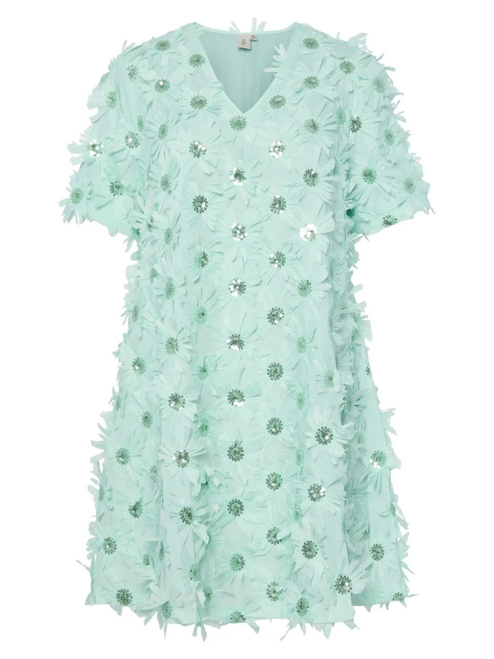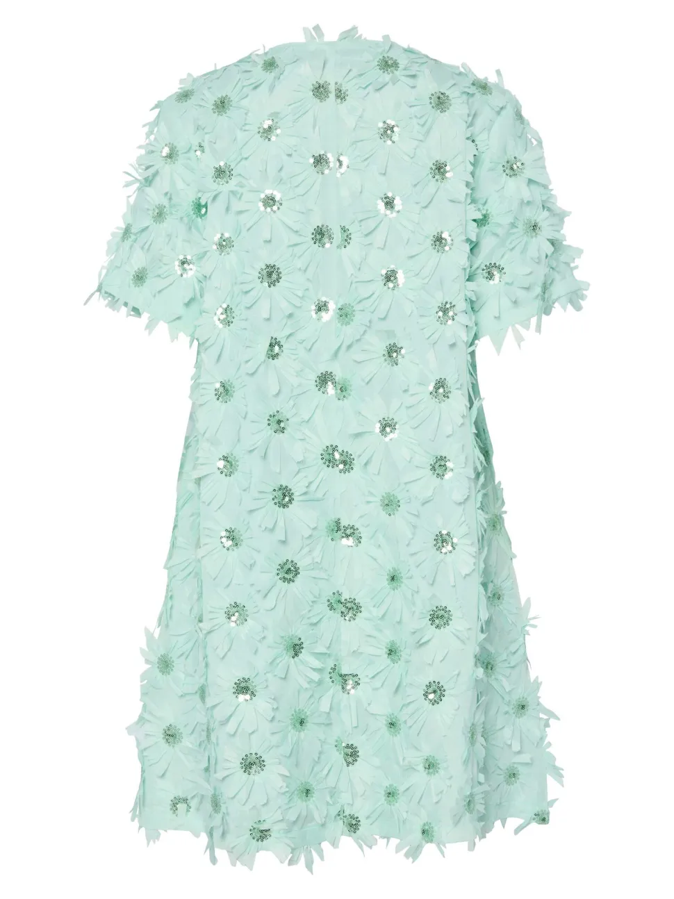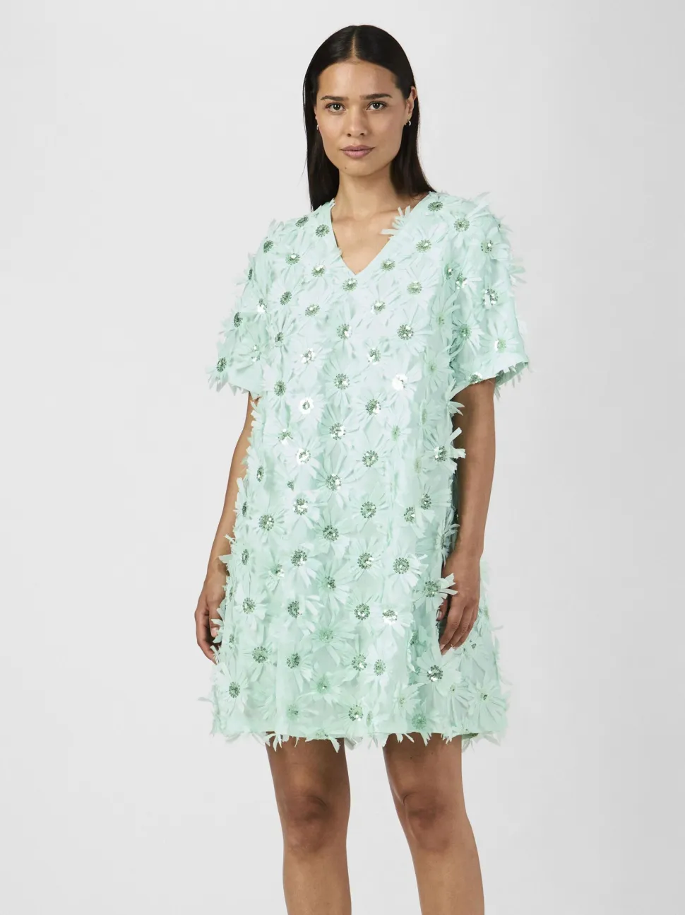 – Koristeltu minimekko – Kauttaaltaan 3D-kukkakuvioitu – Paljettidetaljit – V-pääntie – Lyhyet hihat – Regular fit – Mallilla on yllään koko M