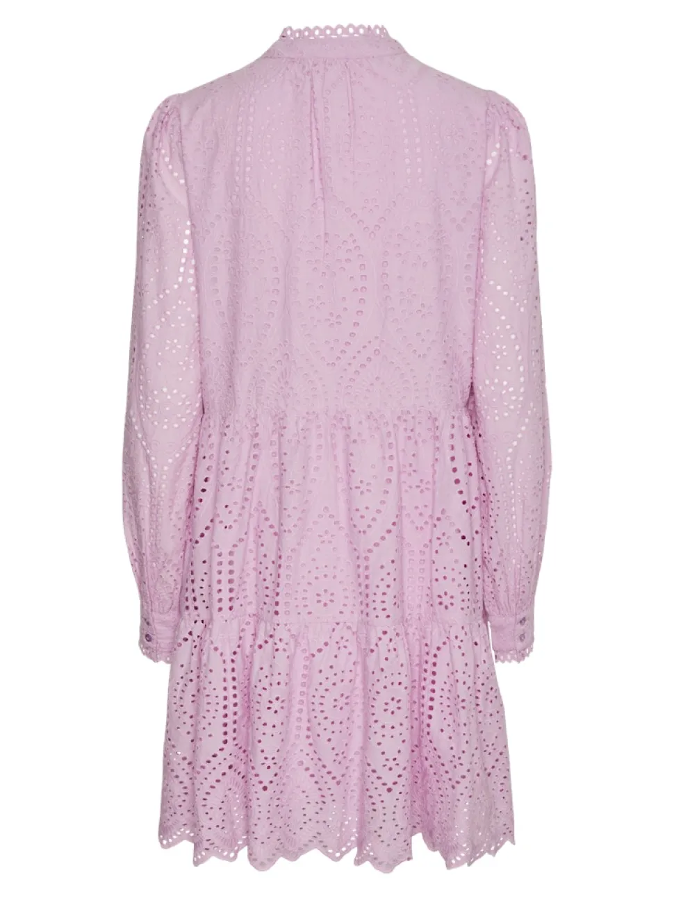 Röyhelöreunainen kiinalaiskaulus, v-pääntie, pallohihat. Hihansuissa röyhelöreunaiset kalvosimet. Kerrostettu helma, jossa brodeerattu siksakmuoto. Mekossa on vuori. Rento istuvuus.