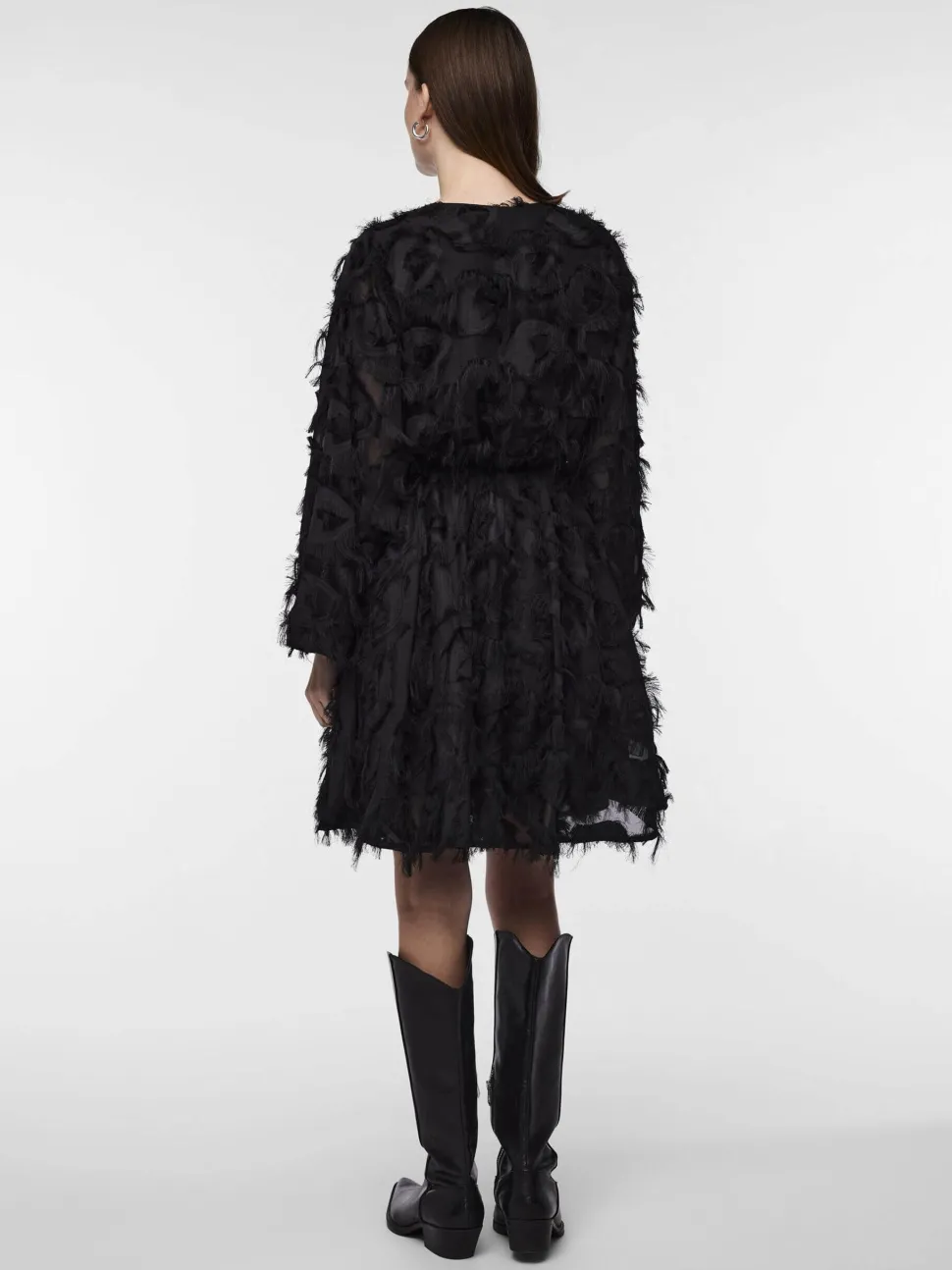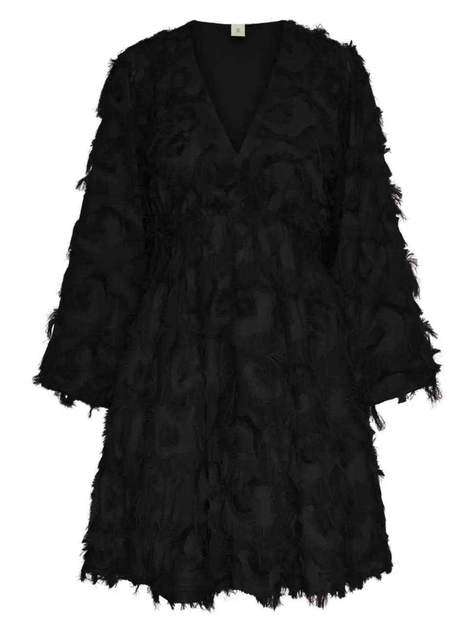 – Teksturoitu minimekko – V-kaula-aukko – Pitkät hihat – Empire-vyötärö – A-linjainen hameosa – Mallilla on yllään koko M