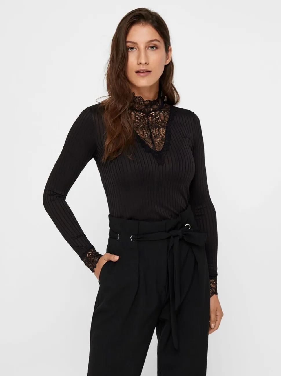 Y.A.S naisten pitkähihainen ribbikangas pusero. Puserossa v-kaula-aukossa ja hihoissa pitsiä yksityiskohtina. Puserossa korkea kaulus. Pusero on joustavaa materiaalia. Lisäksi puseron takana napitus.